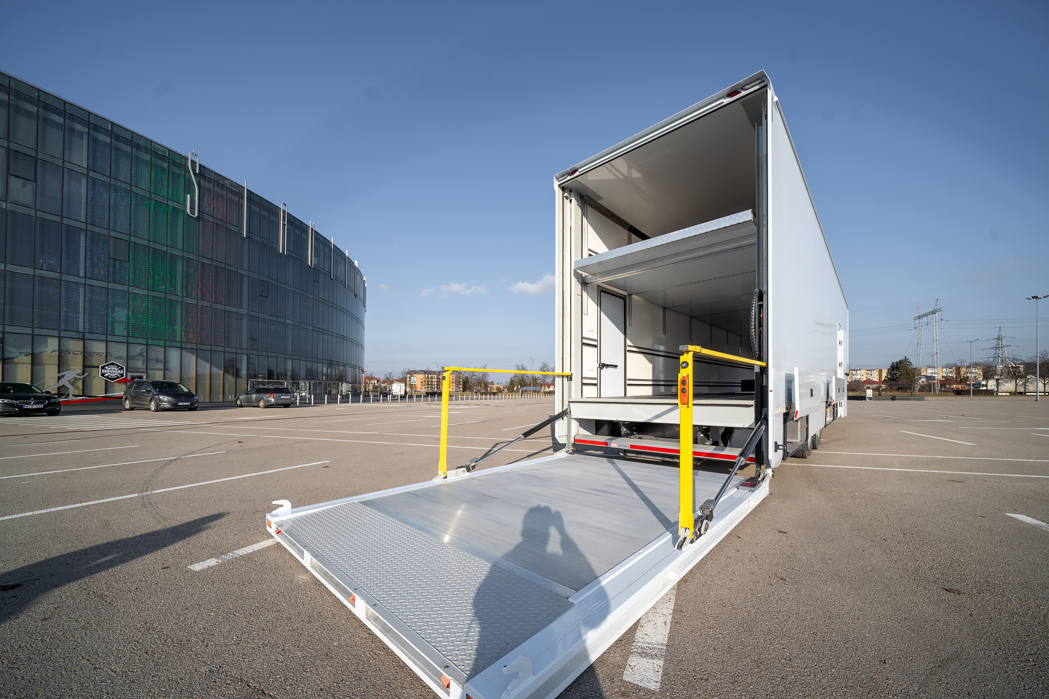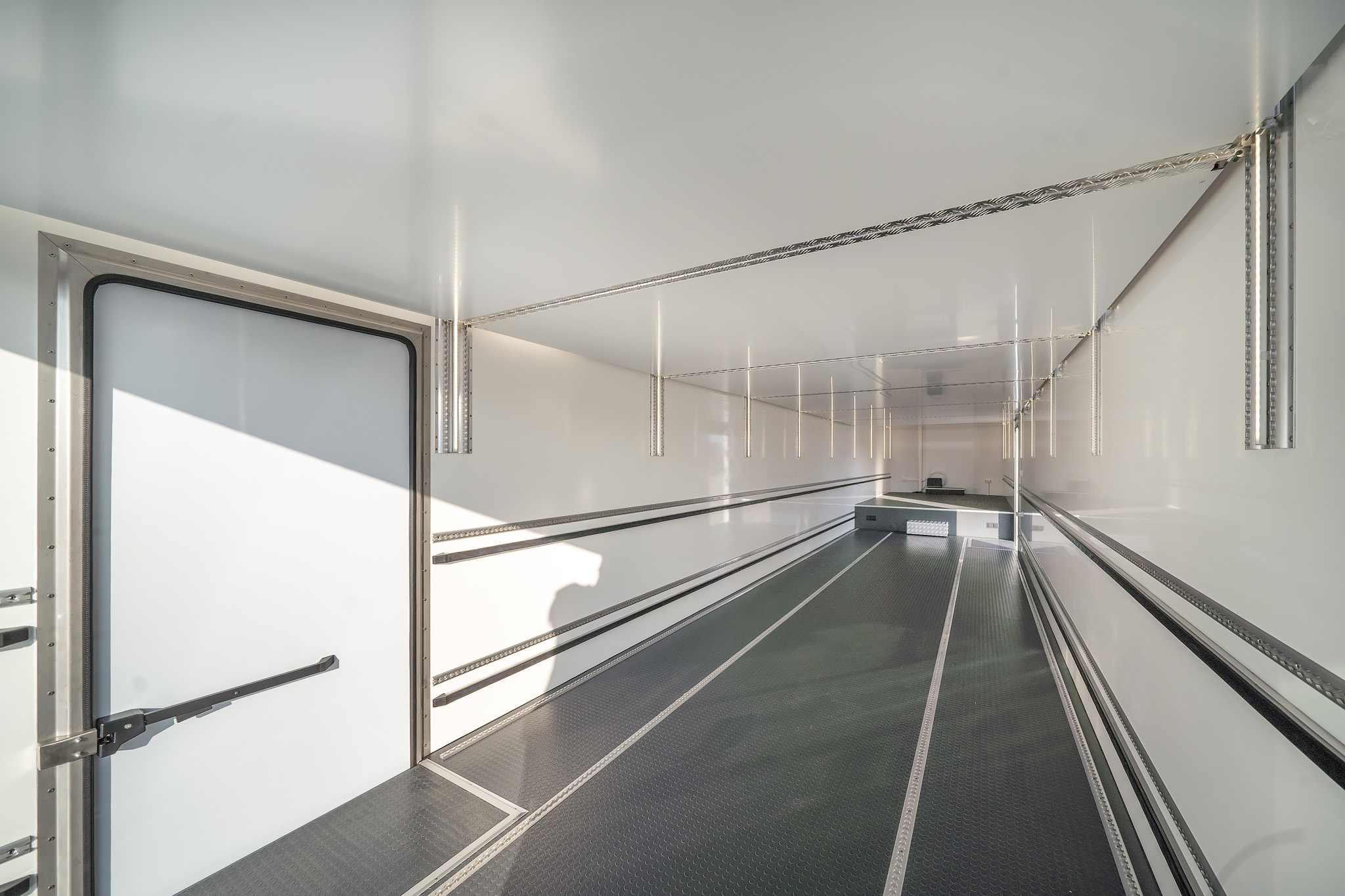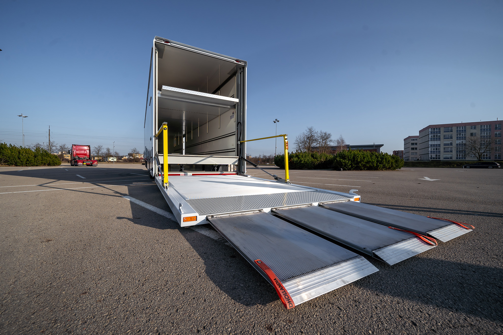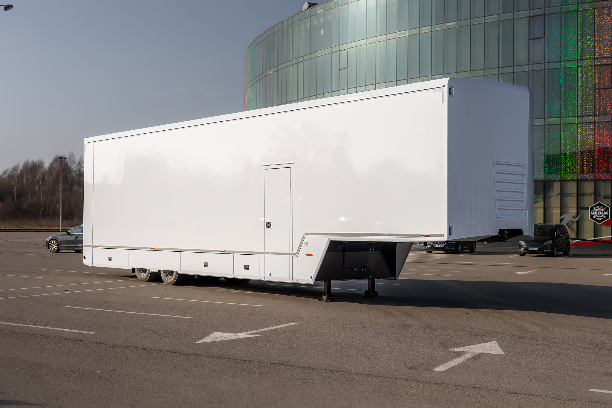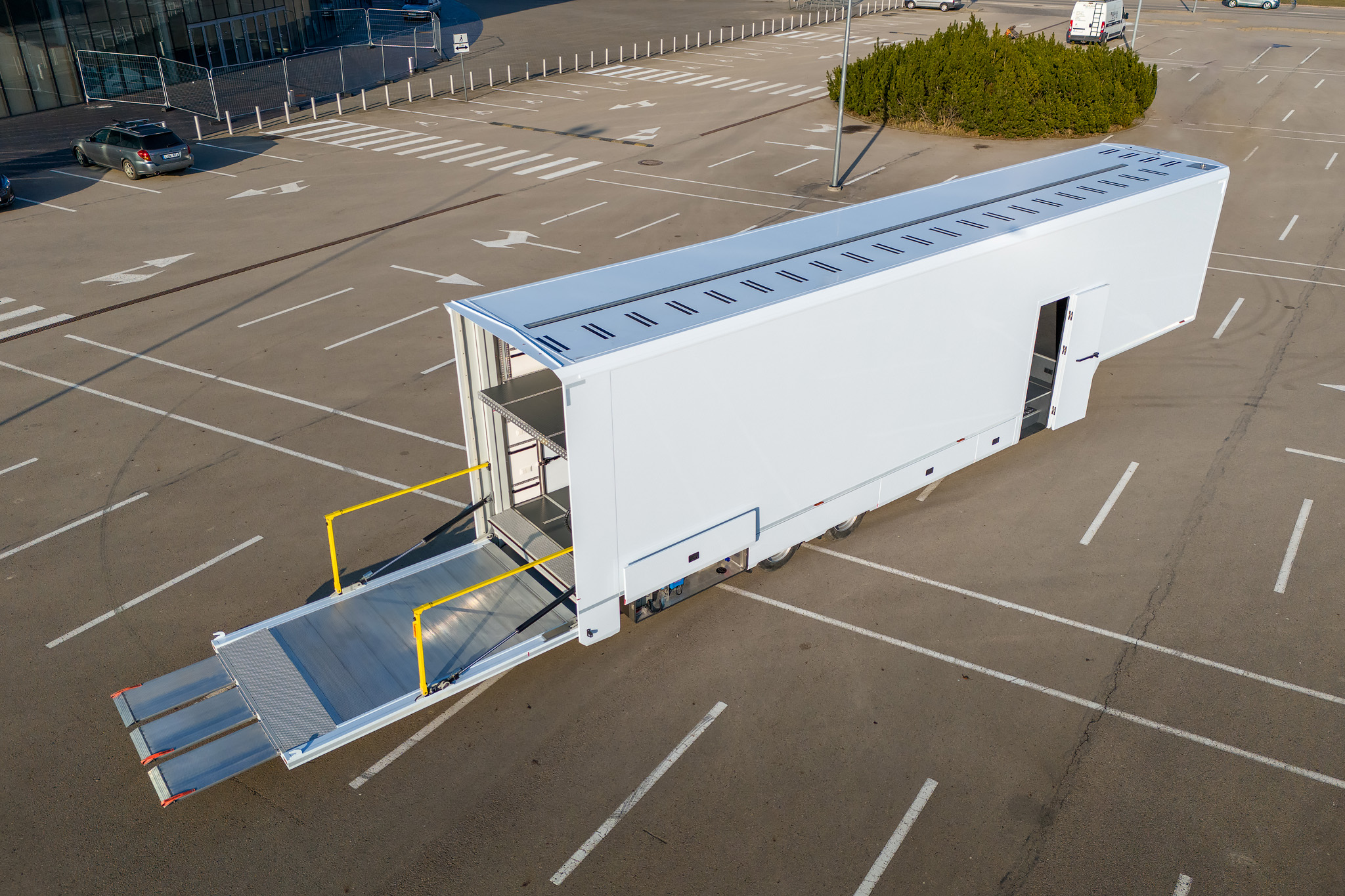 PRO:H2 race trailer includes space for up to 5-6 cars, has internal height of 3.0 meters and comes with underbody compartments for storage and auxiliary equipment. It can optionally be fitted with office and pop-outs.