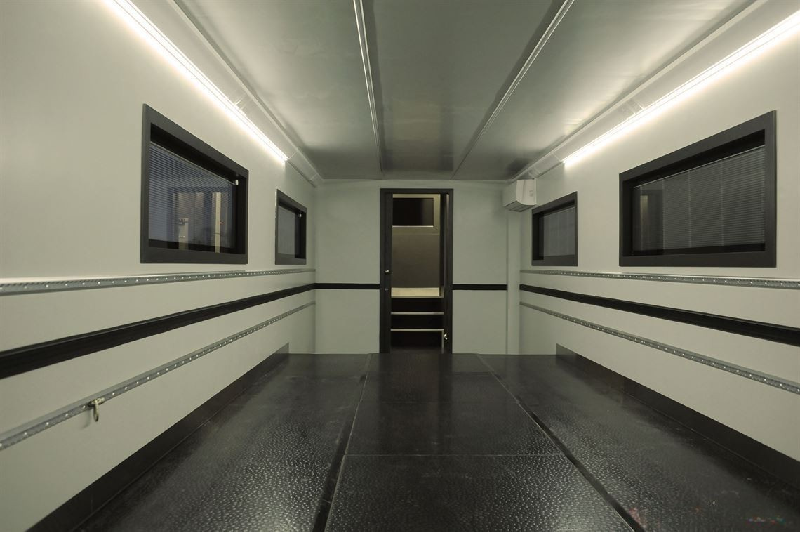Glass doored office with TV and Satellite dish, lower deck with removable centre, perfect for flight cases.
